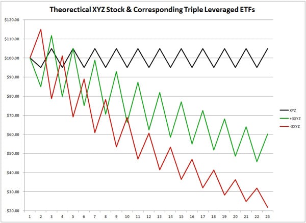 추종 인덱스 가격은 제자리인 반면, 3배수 레버리지는 우하향합니다.