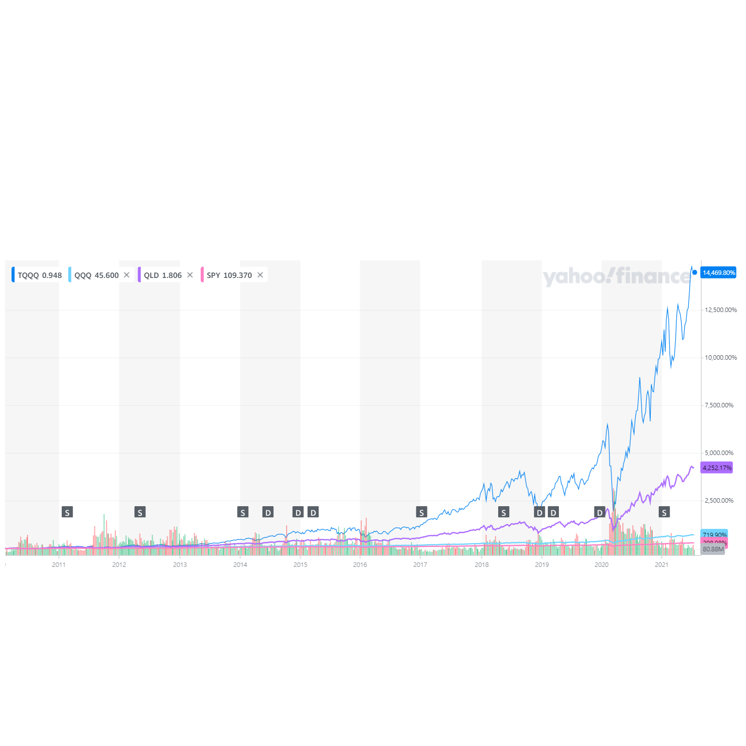 10년 차트를 보면, TQQQ의 압도적인 수익률에