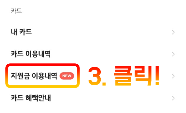 그러면 다음 화면과 같이 카드 탭에서 지원금 이용 내역을 확인할 수 있습니다.