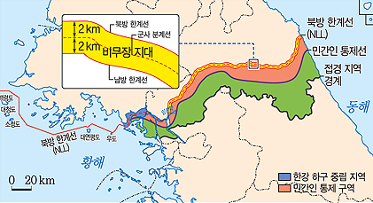 - 범위: 군사 분계선을 경계로 남북으로 각각 2km씩 설정된 남방 한계선과 북방 한계선 사이 지대로 군대 주둔, 무기 배치 금지, 남북한 사이 모든 무력 행위 허용 X 지역.