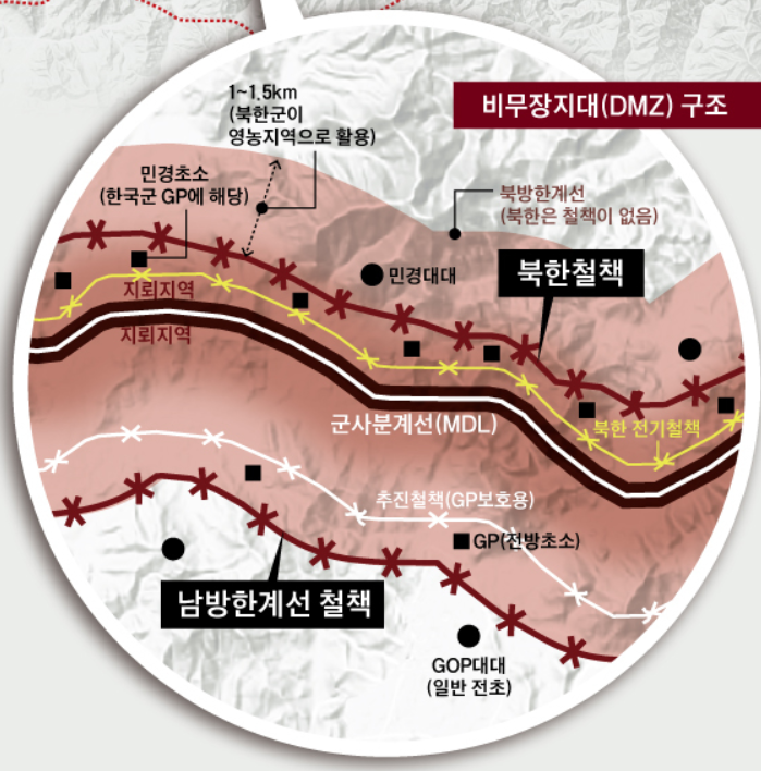 DMZ란 Demilitarized Zone의 약자, 무력 충돌을 막기 위해 국제 조약, 협약 등에 의하여 군대 주둔과 무기의 배치가 금지된 곳을 의미합니다. (그러나 이후 비무장지대의 구조를 살펴보면, 남북 모두 비무장지대 내에 GP라는 초소가 있습니다. 산악지형이므로 높은 능선 아래에서 감시하는 것이 효율적이기에 남북 모두 비무장지대 내에 초소를 전진시켰습니다.)